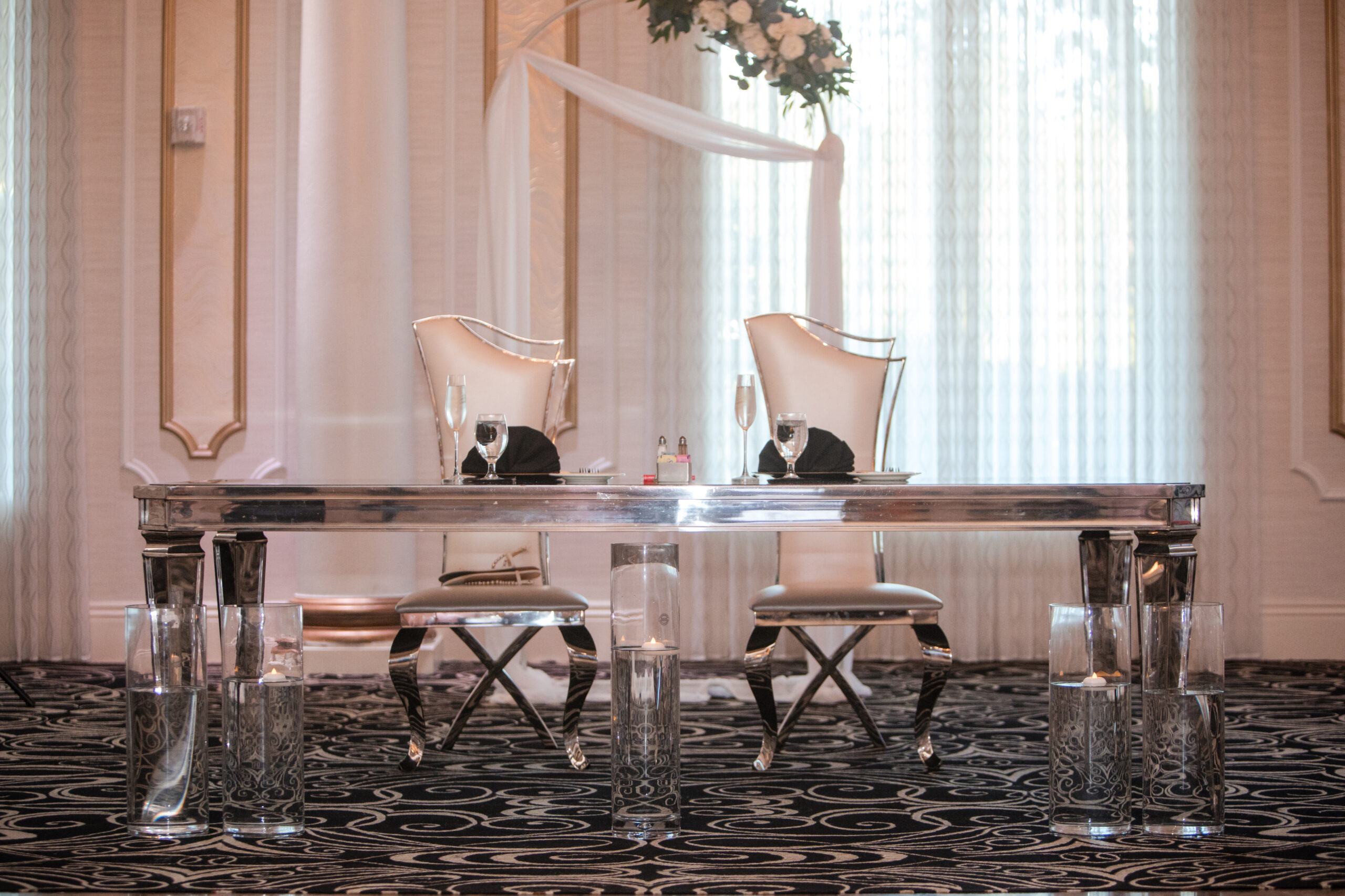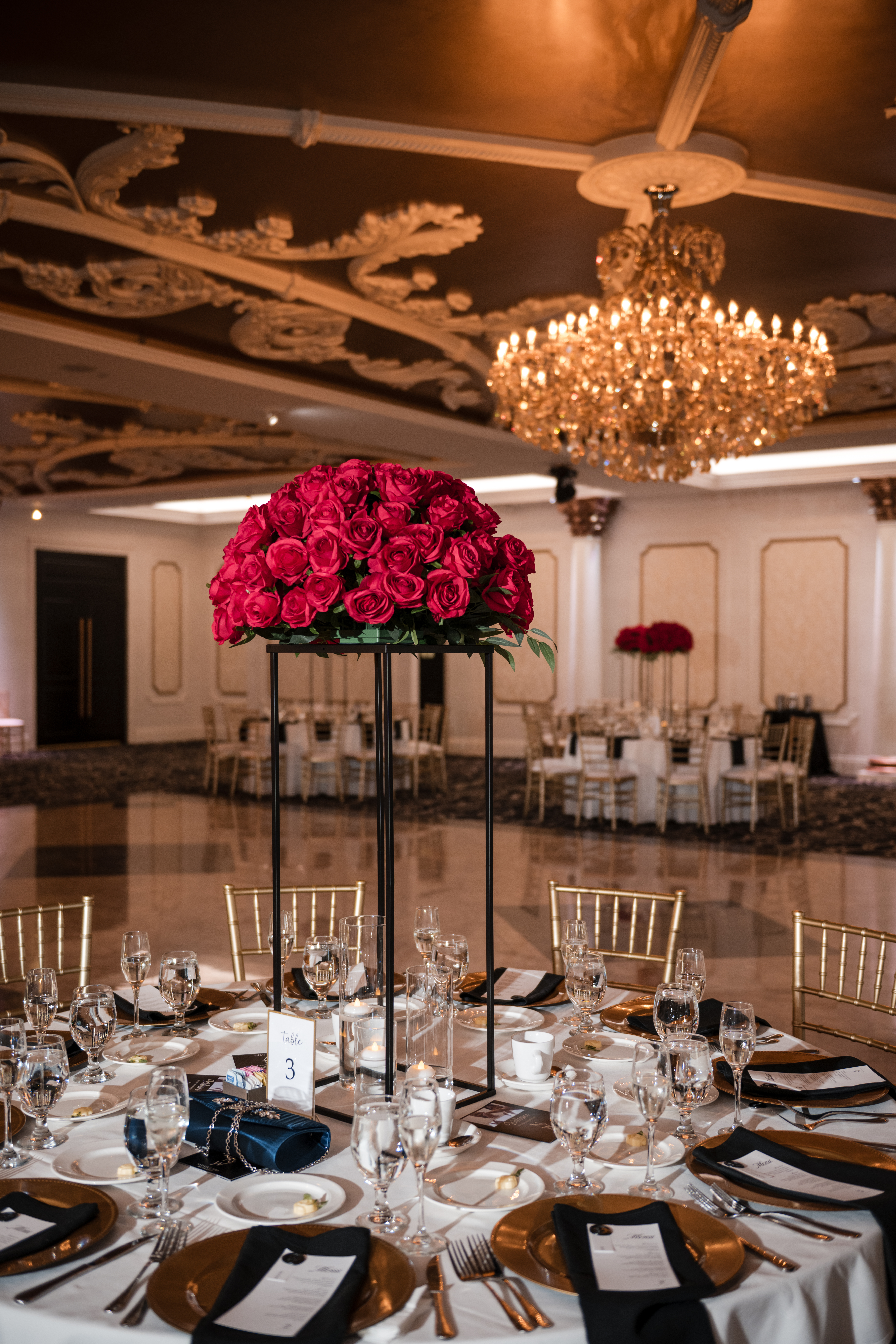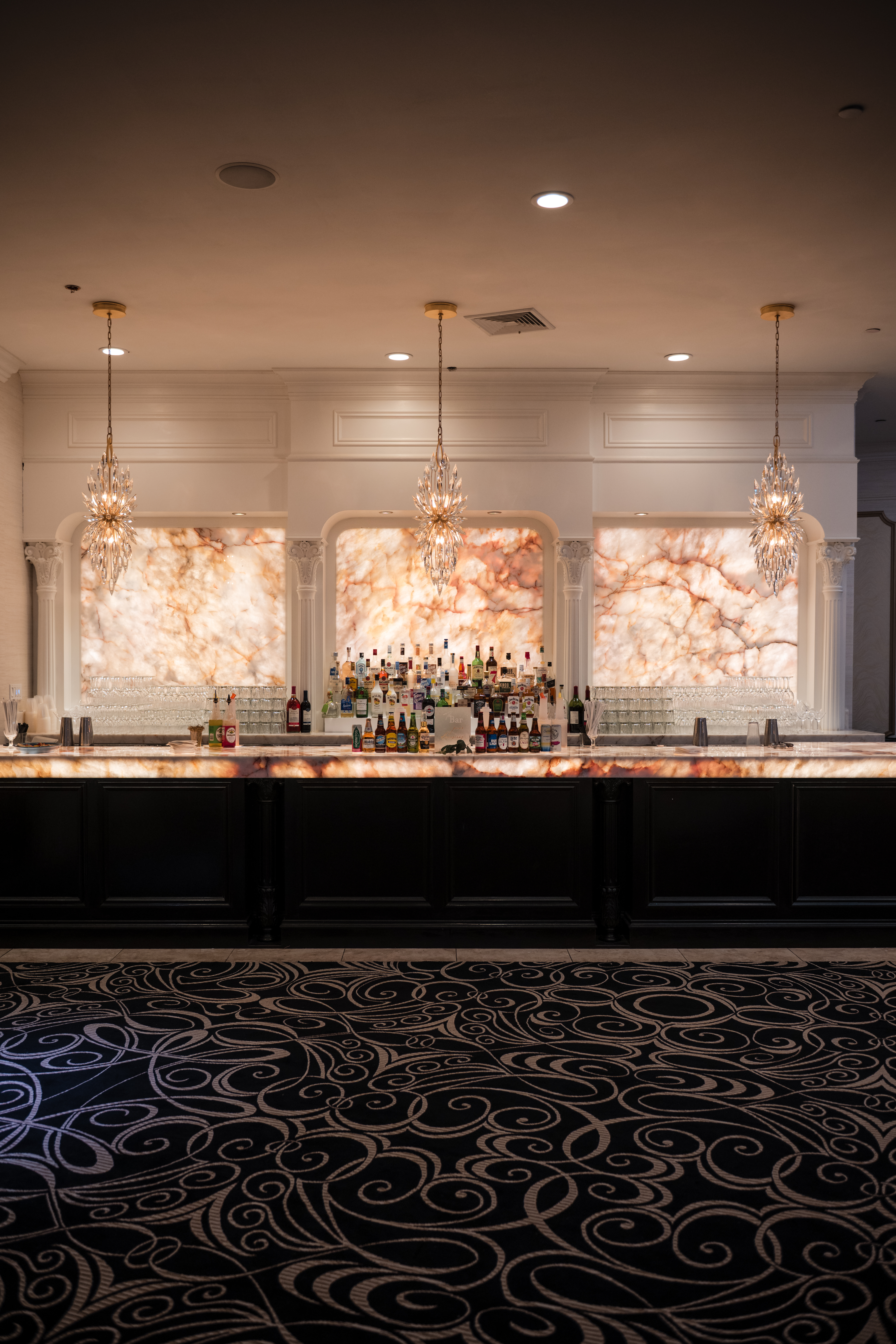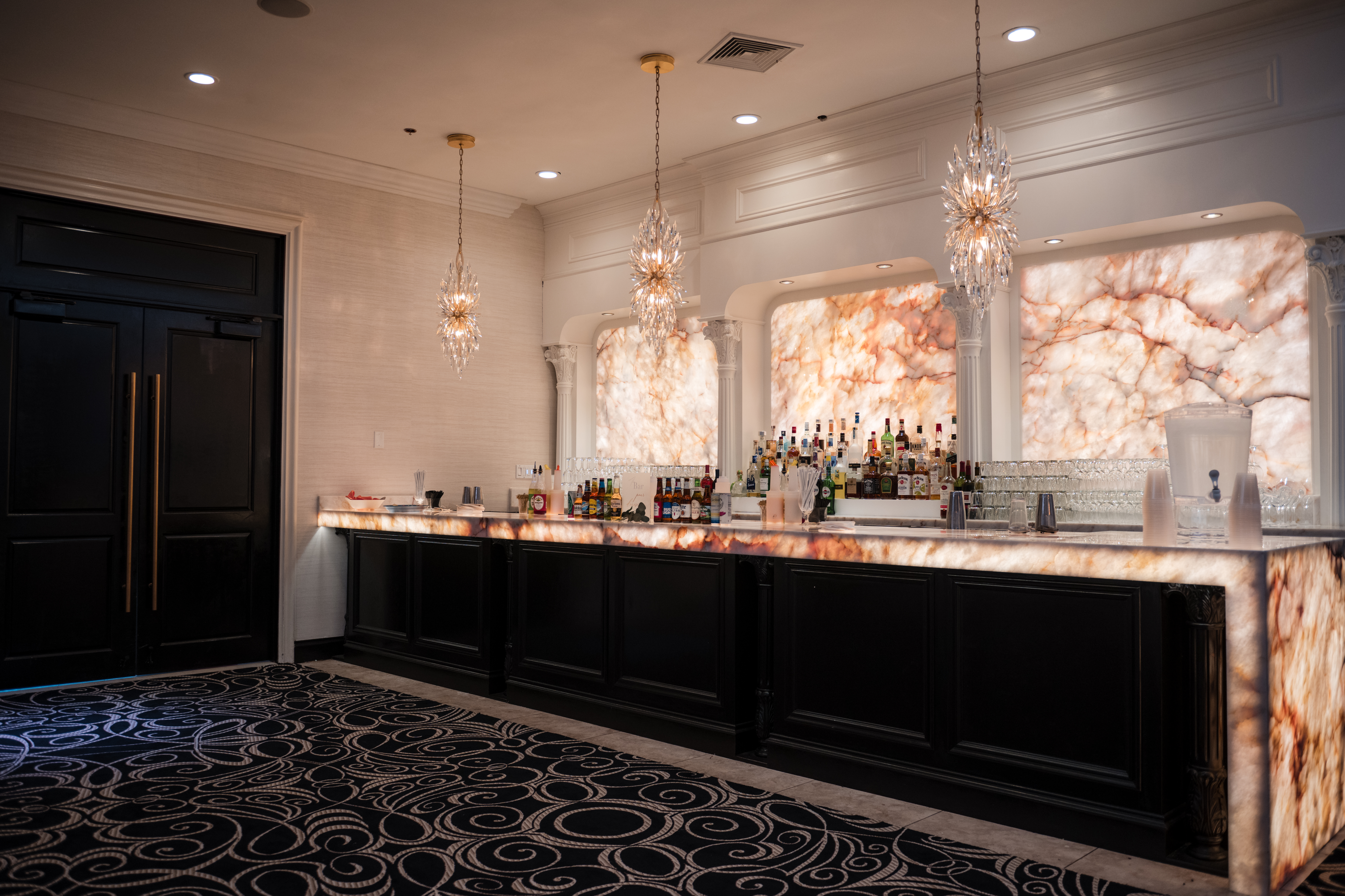 Ideal for events or special events up to 500 guests, the Grand Ballroom features 14-foot ceilings, towering Roman Corinthian marble columns, crystal chandeliers, and an 1,100 square foot marble dance floor. Intelligent lighting accents the ceilings, columns, and dance floor, which can be customized for every event. Use of the Grand Ballroom Patio with our signature waterfall is included.